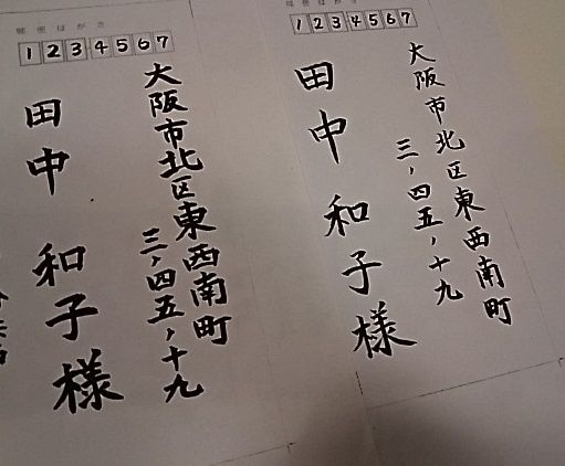 3ヵ月前の右の様に住所を一文字ずつ離して書くのは、よほど字形を上手く書かないと、‘アラ’が目立ってしまいます。